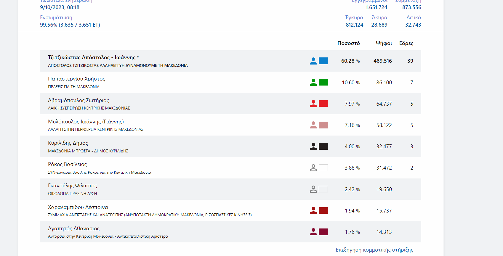 Χαμόγελα στο στρατόπεδο του Απόστολου Τζιτζικώστα με τον Περιφερειάρχη Κεντρικής Μακεδονίας να κερδίζει άνετα την επανεκλογή του με ποσοστό που ξεπερνά το 60%.