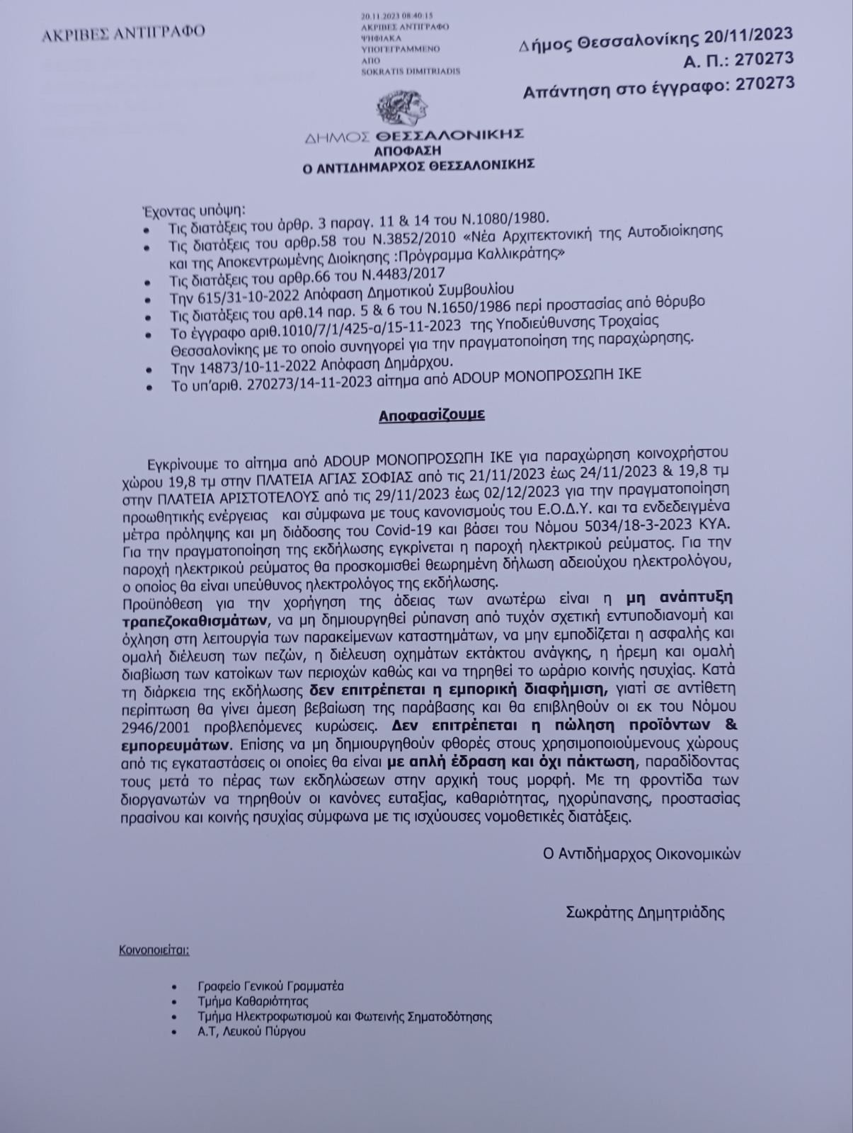 Η parallaxi δημοσιεύει παρακάτω και τη σχετική άδεια που εκδόθηκε από πλευράς του Δήμου Θεσσαλονίκης και του αντιδημάρχου Οικονομικών, Σ. Δημητριάδη.