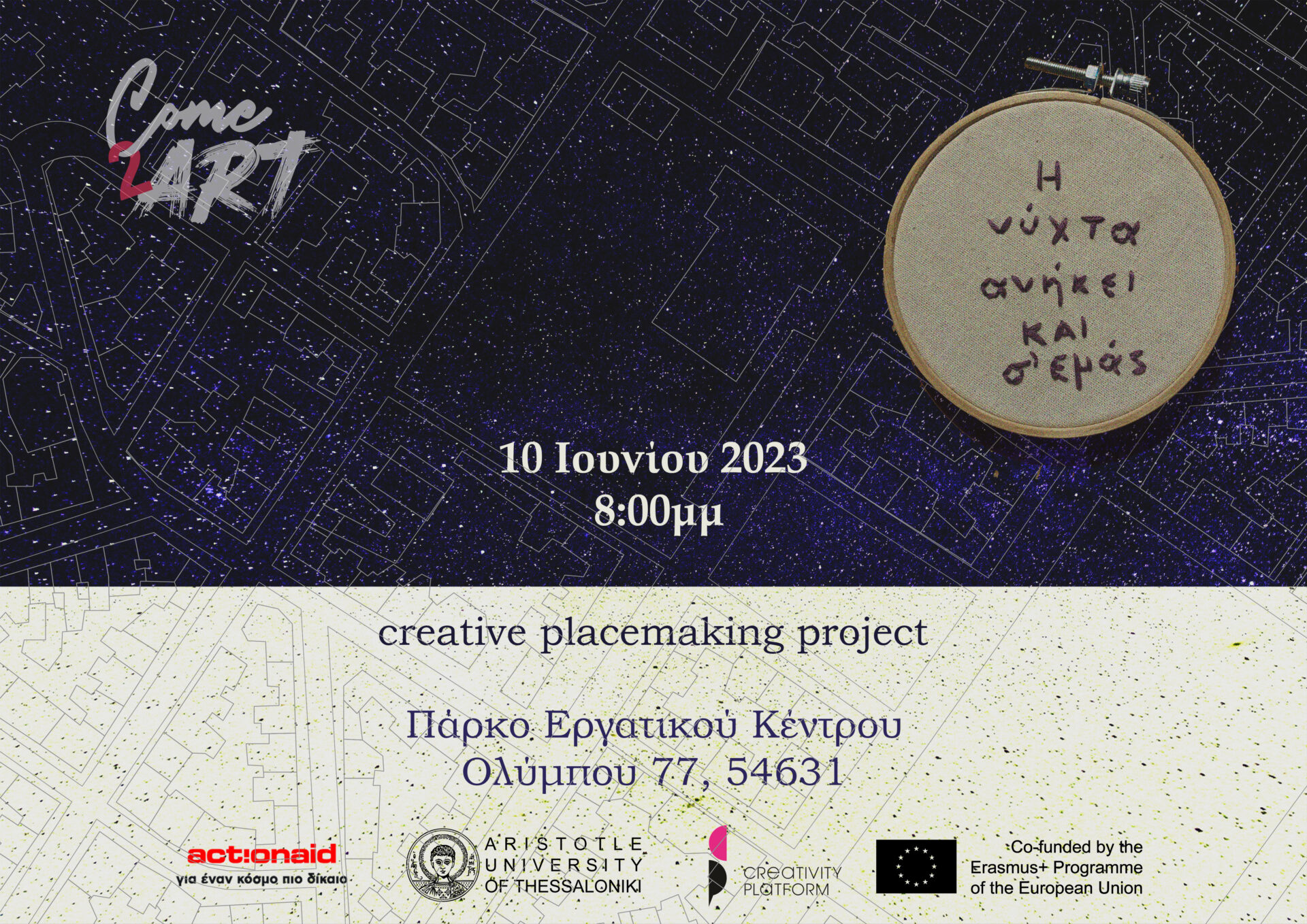 Το ευρωπαϊκό έργο COME2ART, που υλοποιείται στην Ελλάδα από το Κέντρο Νέων της ActionAid στην Θεσσαλονίκη, την Σχολή Καλών Τεχνών του ΑΠΘ και την Creativity Platform, δημιούργησε ένα πλαίσιο συνέργειας μεταξύ καλλιτεχνών/δημιουργών και μελών της κοινότητας, εστιάζοντας κυρίως σε άτομα 18-35 ετών, όπου μέσω του σχεδιασμού και υλοποίησης δράσεων δημιουργικής παρέμβασης στο δημόσιο χώρο (creative placemaking), οι καλλιτέχνες/δημιουργοί να συνεισφέρουν στην ενδυνάμωση της κοινωνικής συνοχής και συγχρόνως, οι νέες και νέοι να αναπτύξουν δεξιότητες ζωής σημαντικές για την προσαρμογή τους στο σύγχρονο κοινωνικό-οικονομικό περιβάλλον. Απώτερος σκοπός είναι η ενδυνάμωση της κοινότητας ώστε να μπορεί να αντεπεξέρχεται στις προκλήσεις και να γίνει πιο ανθεκτική.