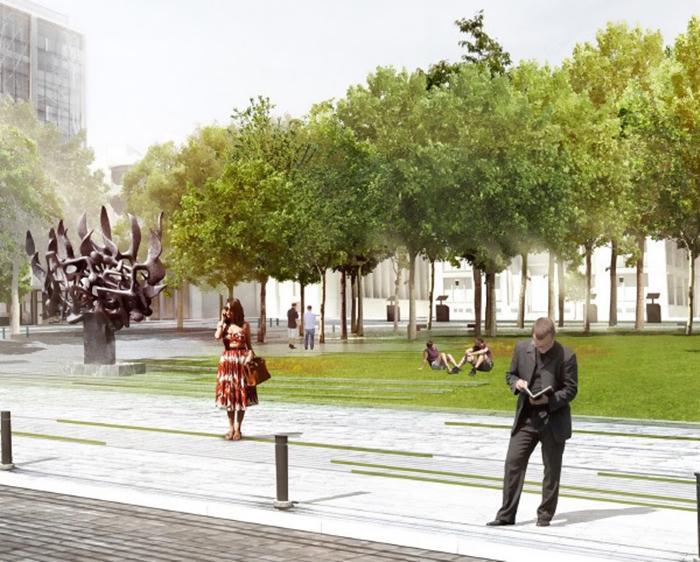 - Τη δημιουργία μιας ισχυρής συστάδας δέντρων σε θέση η οποία ενισχύει τόσο το υφιστάμενο ψηλό πράσινο, όσο και τους υπόλοιπους περιβαλλοντικούς συντελεστές, χωρίς να διασπά την ενότητα της πλατείας