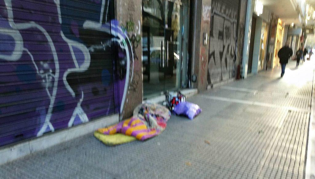 Σήμερα το πρωί στα πεζοδρόμια της Τσιμισκή, μία γνώριμη δυστυχώς εικόνα από την περιουσία ενός αστέγου. Ένα λεπτό σκέπασμα, κάτι για μαξιλάρι και ένα καροτσάκι για “βαλίτσα”.