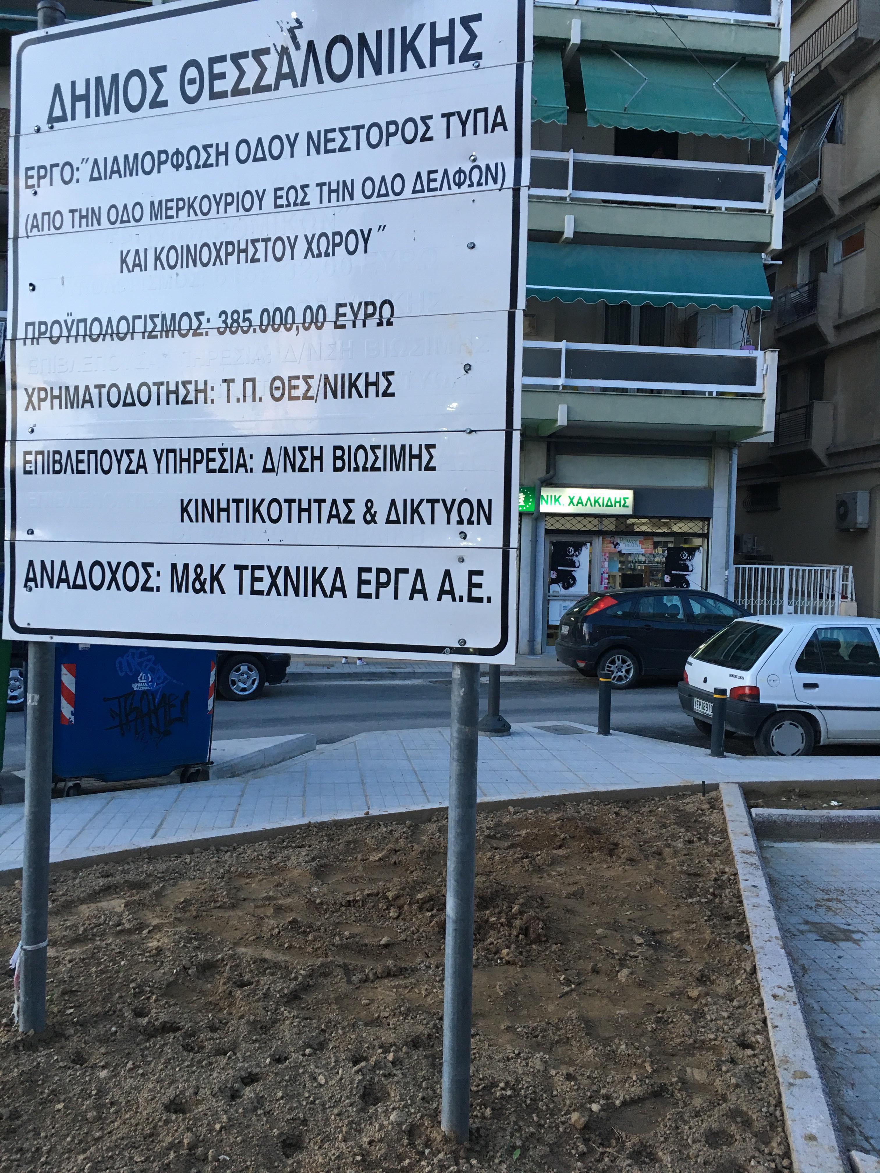 Η ανάπλαση όπως αναφέρει η πινακίδα κοστίζει 385.000 ευρώ, το καλοκαίρι ειπώθηκε το ποσό για συνολική δαπάνη που προκύπτει από τη σύμβαση ανέρχεται τα 157.989,16 ευρώ, στον προυπολογισμό του 2018 η Ανάπλαση Νέστορος Τύπα αναφέρεται με προϋπολογισμό 77.989,16€ και περιλαμβάνει και το φωτισμό και τη διαμόρφωση της, τη δημιουργία ελεύθερων χώρων στάθμευσης, διαπλατύνσεις πεζοδρομίων, ανάδειξη της υφιστάμενης υψηλής βλάστησης και κατασκευή καθιστικών για τη στάση και αναψυχή των κατοίκων.