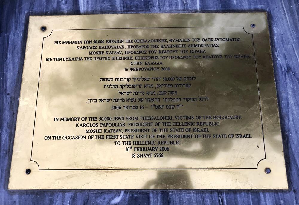 “Εις μνήμην των 50.000 Εβραίων της Θεσσαλονίκης, θυμάτων του Ολοκαυτώματος Κάρολος Παπούλιας, Πρόεδρος της Ελληνικής Δημοκρατίας Moshe Katsav, Πρόεδρος του Κράτους του Ισραήλ Με την ευκαιρία της πρώτης επίσημης επίσκεψης του προέδρου του κράτους του Ισραήλ στην Ελλάδα”.