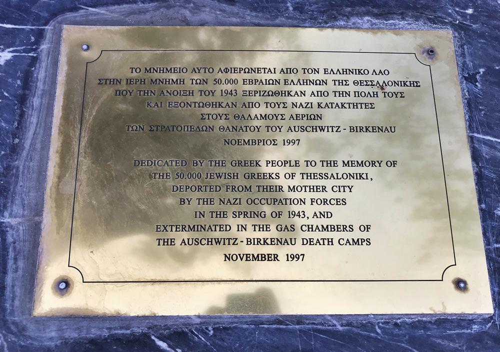 “To μνημείο αυτό αφιερώνεται από τον Ελληνικό Λαό στην ιερή μνήμη των 50.000 Εβραίων Ελλήνων της Θεσσαλονίκης, που την άνοιξη του 1943 ξεριζώθηκαν από την πόλη τους και εξοντώθηκαν από τους Ναζί κατακτητές στους θαλάμους αερίων των στρατοπέδων θανάτου του AUSCHWITZ – BIRKENAU”.