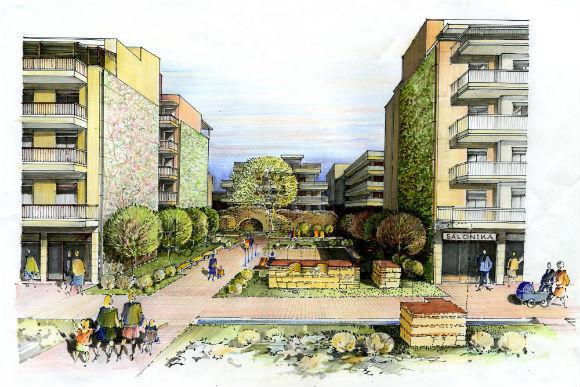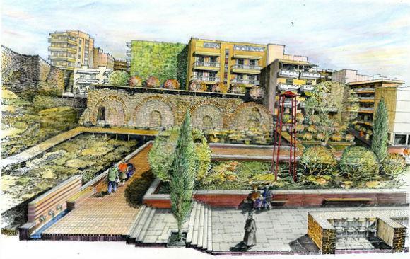 Επίσης προτείνει την χρήση του υδάτινου στοιχείου στις διαμορφώσεις, που επαναφέρει στη μνήμη τη συνεχή παρουσία του στην περιοχή και τονίζει την ύπαρξη της βυζαντινής κινστέρνας, την αισθητική αναβάθμιση με εικαστικές παρεμβάσεις (βρύση, φωτισμός) και καλαίσθητες πληροφοριακές επιγραφές αλλά και αναβάθμιση των μετώπων των οικοδομών με κάθετους κήπους.