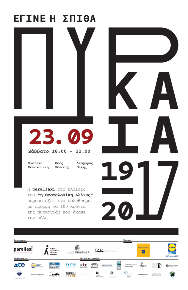 Στις 23 Σεπτεμβρίου η Θεσσαλονίκη ένα πολυθέαμα-στοχασμός πάνω στα εκατό χρόνια από την Πυρκαγιά του 1917. Στους δρόμους της πόλης από την parallaxi.