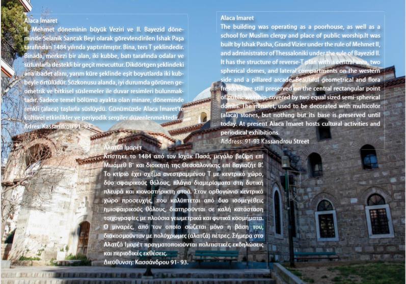 Ξεκινώντας από τα γνωστότερα, το σπίτι-μουσείο του Μουσταφά Κεμάλ-Ατατούρκ, το Διοικητήριο που χτίστηκε από τον Ιταλό αρχιτέκτονα Vitaliano Poselli, το Μπεζεστένι, το Αλατζά Ιμαρέτ, παρουσιάζονται  στα ελληνικά, αγγλικά και τουρκικά  συνολικά 26 μνημεία. Παλαιότερο όλων το «Μπέη Χαμάμ» (Λουτρά Παράδεισος), το πρώτο οθωμανικό λουτρό της Θεσσαλονίκης που κτίστηκε το 1444. Είναι και το μεγαλύτερο που σώζεται.