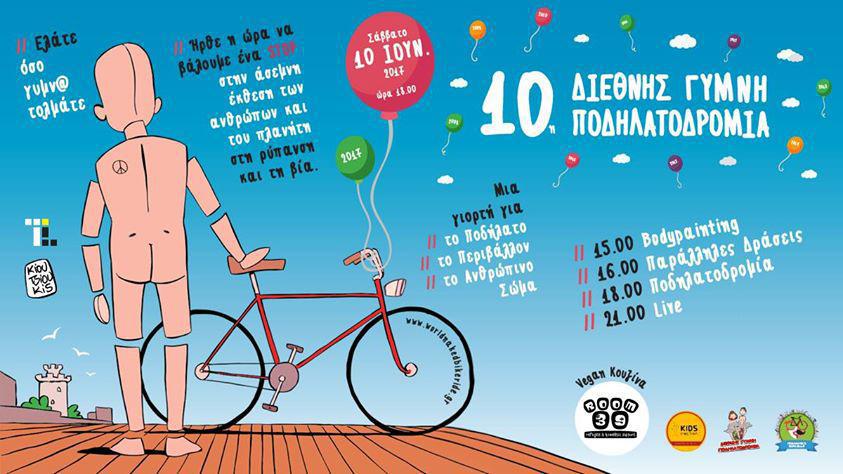 Ήρθε η ώρα να βάλουμε ένα STOP στην “άσεμνη” έκθεση των ανθρώπων και του πλανήτη στη ρύπανση και τη βία. Μια γιορτή για το Ποδήλατο, το Περιβάλλον, το Ανθρώπινο σώμα, το Σάββατο 10 Ιουνίου στη Θεσσαλονίκη. Η Διεθνής Γυμνή Ποδηλατοδρομία είναι ένα διεθνές κίνημα και συμμετέχουν σε αυτό περισσότερες από 70 πόλεις σε όλο τον κόσμο. Στην Ελλάδα γιορτάζουμε φέτος τα 10 χρόνια, με ένα ολοήμερο φεστιβάλ, με συναυλίες, δρώμενα, και παράλληλες δράσεις.