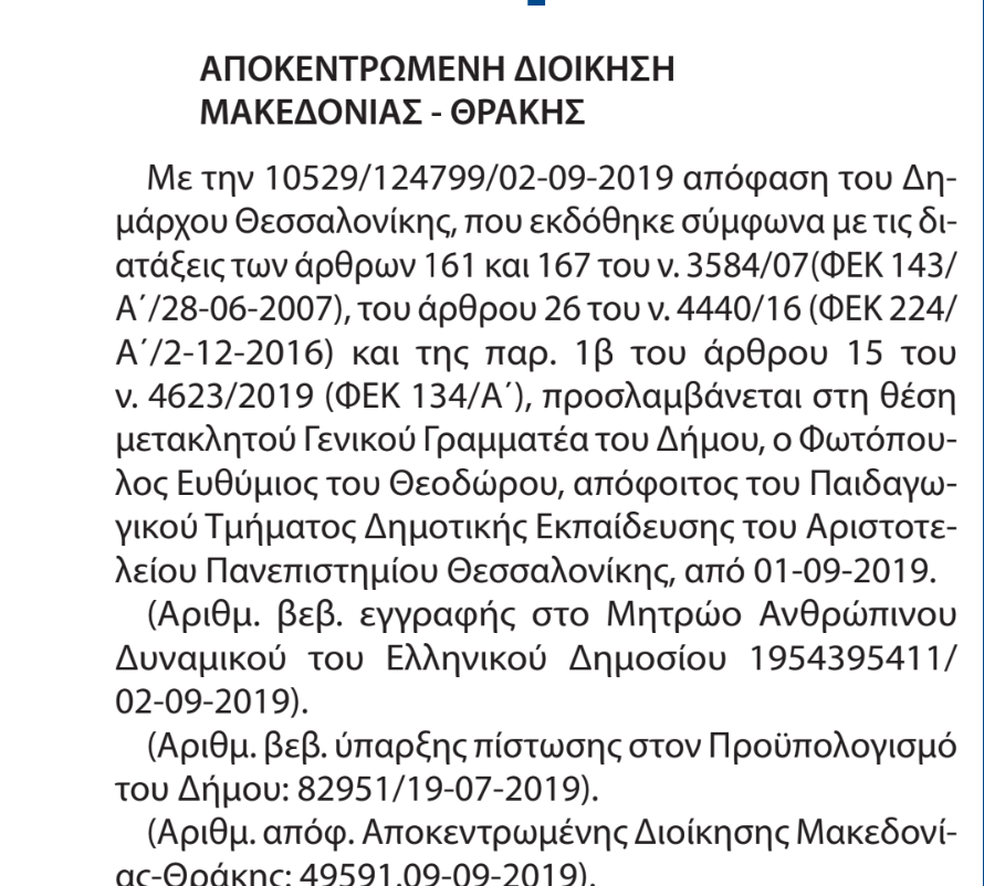 Ο Γ.Γ. του Δήμου Θεσσαλονίκης κατέχει νομότυπα τη θέση του;