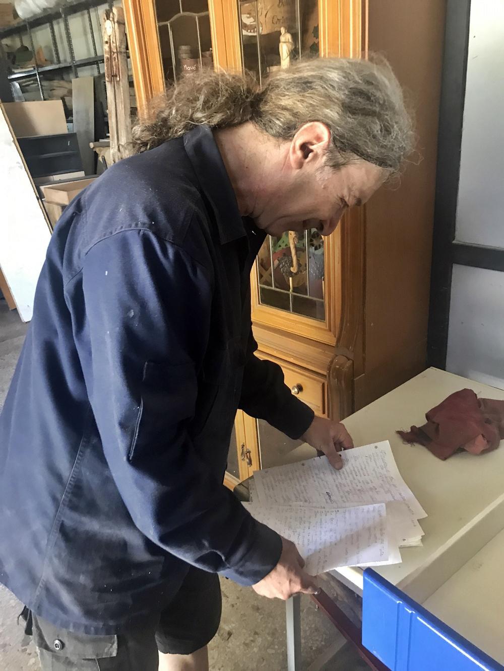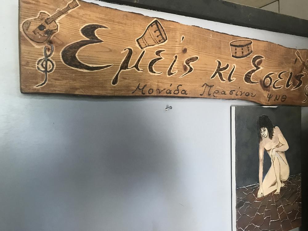 Έχουμε μια καλλιτεχνική ομάδα μουσικής, τους «Εμείς και εσείς», παίζω τύμπανα και τραγουδάω κάποιες φορές. Έχουμε φτιάξει το στούντιο εδώ δίπλα στο εργαστήριο ξυλογλυπτικής και κάνουμε πρόβες. Από 16 ετών παίζω τύμπανα, από μικρό παιδί ασχολούμουν με τη μουσική.