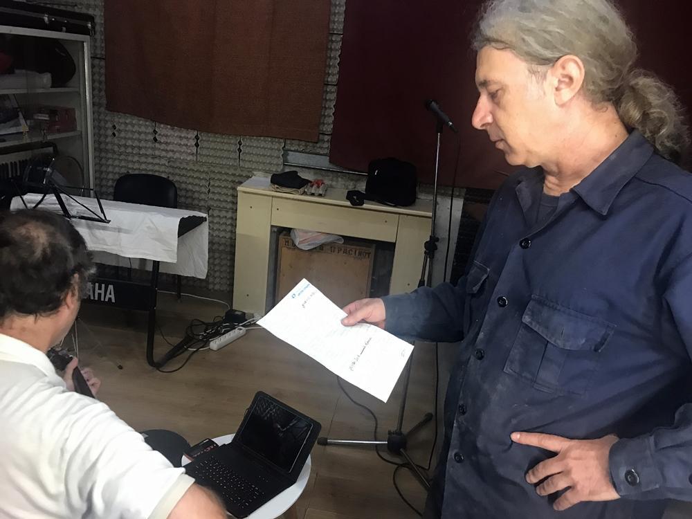 Είχα ένα πρόβλημα με την υγεία μου, που μου γύρισε σε κατάθλιψη. Κάποια στιγμή γνώρισα τυχαία, από έναν κοινό γνωστό μας, τον Κώστα Κόντο, επιστημονικά υπεύθυνο της Μονάδας Πρασίνου και μου πρότεινε να έρθω για κλαδέματα και κουρέματα στην μονάδα. Αργότερα βρέθηκα να κρατάω και αυτό το συνεργείο γιατί δεν υπήρχε άλλος και έτσι έγινε η αρχή και η αλχημεία με την Μονάδα Πρασίνου. Ο Κώστας Κόντος, ως υπεύθυνος της Μονάδας Πρασίνου, είναι πάρα πολύ ανοιχτόμυαλος και ο ίδιος φύση καλλιτεχνική. Είδε ότι μπορούσαμε να κάνουμε πολλά περισσότερα από κλαδέματα και μας παρότρυνε να το κάνουμε. Τα μουσικά όργανα που χρησιμοποιούμε υπήρχαν από την προηγούμενη υπεύθυνη του συγκροτήματος που συνταξιοδοτήθηκε. Τα όργανα έμειναν αποθηκευμένα και, κάνοντας κάποιες εργασίες, τα βρήκα τυχαία και είπα στον κύριο Κόντο αν μπορούμε να τα χρησιμοποιήσουμε για να κάνουμε ένα στούντιο και ένα συγκρότημα. Έτσι φτιάχτηκε το στούντιο, βρέθηκαν οι μουσικοί και έγιναν οι «Εμείς και εσείς». Γράψαμε και ένα κομμάτι για ένα θεατρικό έργο, για το οποίο είχαμε την μουσική επιμέλεια. Το τραγούδι έχει το όνομα του συγκροτήματος «Εμείς και εσείς». Η Μονάδα Πρασίνου σου γεμίζει την ζωή, σου δίνει ένα νόημα. Εδώ έχω ένα στούντιο μουσικής που δεν το είχα ποτέ στην ζωή μου, έπρεπε να πληρώνω για να το έχω. Κουράζομαι με την ξυλογλυπτική, περνάω στο στούντιο και κάνω μουσική. Κουράστηκα με την μουσική, περνάω στην ξυλογλυπτική και έτσι γεμίζει η μέρα μου. Το κάνω κάθε μέρα.