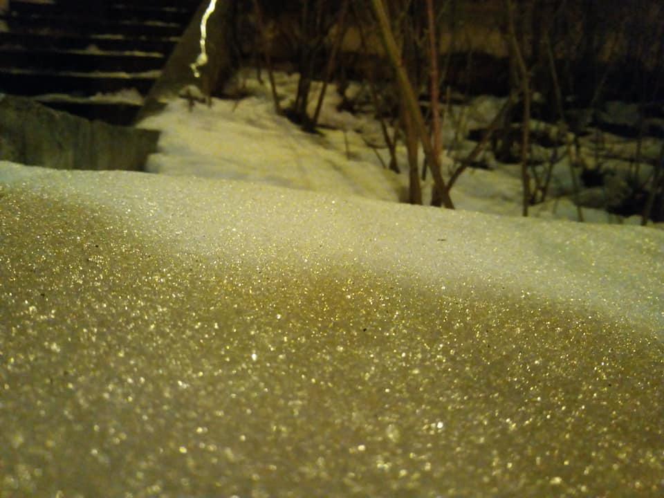 Ψηλά στις Συκιές, κοντά στην Επταπυργίου, το χιόνι που δεν έλιωσε ακόμα ανά σημεία στις γειτονιές δημιουργεί ένα εντυπωσιακό θέαμα τη νύχτα. Σε συνδυασμό με το ζεστό κίτρινο φωτισμό δημιουργεί την ψευδαίσθηση του “χρυσού” χρώματος.