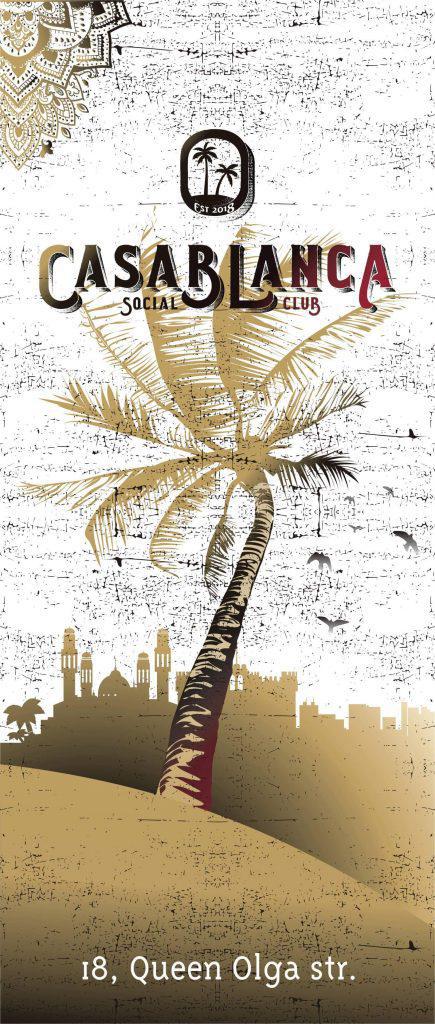 Ανοίγει τις πόρτες της στο τέλος Σεπτεμβρίου, προσδιορίζεται ως Social Club με τον τρόπο που το αντιλαμβάνεται ο καθένας ξεχωριστά και στοχεύει να γίνει το απόλυτο αστικό meeting point. Διατηρώντας και αναδεικνύοντας σε πολλά σημεία της έπαυλης την ιστορική αρχιτεκτονική και τα ιδιαίτερα χαρακτηριστικά της -όπως είναι τα γύψινα της οροφής για παράδειγμα- και συνδυάζοντάς τα με σύγχρονα elegant στοιχεία, η Καζαμπλάνκα διαρθρώνεται σε δύο ορόφους, με δύο εξωτερικές αυλές -μπροστά και πίσω- και διαφορετικά στημένα “σύμπαντα” στο εσωτερικό της έτσι ώστε ο καθένας να βρει αυτό που του ταιριάζει. Από το πρωί μέχρι και το βράδυ εδώ θα μπορούν να συναθροίζονται αρμονικά χωρίς κανόνες dress code και καμία επιβολή συμπεριφορών, όλοι όσοι ψάχνουν τον πιο οικείο τόπο τους στην πόλη. Για καφέ και πρωινό, brunch, ελαφριά γεύματα, early drinks, επαγγελματικές συναντήσεις, παρέες και πρώτα ραντεβού και ό,τι άλλο έχουν ανάγκη οι άνθρωποί της. Δηλαδή Θεσσαλονικείς, εσείς, εμείς, περαστικοί, επισκέπτες.