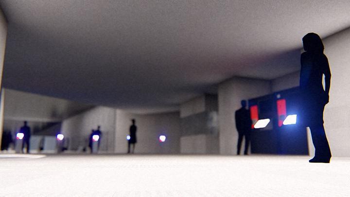 Μεγάλες οθόνες και ψηφιακές εκτυπώσεις με οπίσθιο φωτισμό, με κινούμενα και ακίνητα έργα αντίστοιχα, τοποθετούνται στους δύο μεγάλους παράλληλους τοίχους, σε διάφορα σημεία στα ενδιάμεσα επίπεδα ή άνωθεν των συρμών.