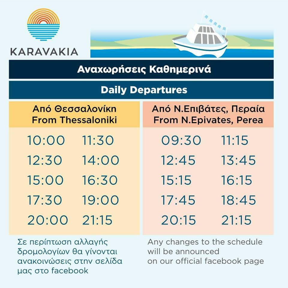 Με το καθιερωμένο, πλέον, μότο, ‘Κάθε Μέρα Θάλασσα’, τα «Karavakia Thessaloniki Waterbus», έχοντας αφετηρία τους το λιμάνι της Θεσσαλονίκης, στην Προβλήτα Α’, και κάνοντας στάση στο Λευκό Πύργο, προσεγγίζουν καθημερινά τις βραβευμένες, με τη «Γαλάζια Σημαία» παραλίες, της Περαίας και των Νέων Επιβατών, σε λιγότερο από μία ώρα.