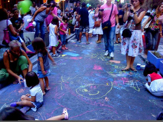 Προξένου Κορομηλά – Ο δρόμος των παιχνιδιών Για τέσσερις ώρες η Προξένου Κορομηλά μετατράπηκε σε έναν απέραντο παιδότοπο. Πλουτάρχου με Καρόλου Ντηλ διοργάνωσε το Κρατικό Μουσείο Σύγχρονης Τέχνης εικαστικά εργαστήρια για παιδιά με σκοπό τη μεταμόρφωση του αστικού τοπίου. Καρόλου Ντηλ με Αγ. Σοφίας η Lalaland έστησε ένα μεγάλο επιδαπέδιο «φιδάκι», και παιχνιδιάρικα μονοπάτια. Μεγάλος στόχος η κατασκευή της… Πολυκατοικίας των Ευχών, μίας οικολογικής κατασκευής. Αγ. Σοφίας με Βογατσικού το δημοτικό σχολείο του δρόμου γέμισε ζωή και το απόγευμα. Η Σοφία Σούπαρη από τις εκδόσεις «Επόμενος Σταθμός» και καλλιτέχνες προσκαλεσαν παιδιά και γονείς να στήσουν ένα θέατρο σκιών και να παίξουν στο προαύλιο του σχολείου. Παράλληλα, η Ανθή Θάνου δημιούργησε τη δική της γωνιά των παραμυθιών. Βογατσικού με Χρυσοστόμου Σμύρνης μία ομάδα της ΧΑΝΘ δημιούργησε το δικό της «Οικολόγιο», ένα εκπαιδευτικό παιχνίδι σε όλο το μήκος του δρόμου αλλά και μία πράσινη παρέμβαση στο πλέγμα του ελεύθερου οικοπέδου. Χρυσοστόμου Σμύρνης με Μόρκενταου τα «Παιδιά εν Δράσει» αναβίωσαν ομαδικά παιχνίδια που χάθηκαν στο χρόνο. Τζαμί, Πόλεμος και Ειρήνη, Κουτσό και πολλά ακόμη παιχνίδια μετά από πολλά χρόνια σε έναν κεντρικό δρόμο της Θεσσαλονίκης.