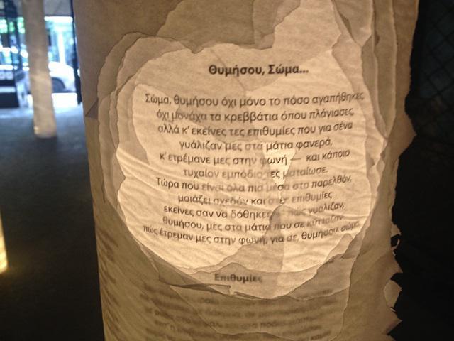 Το έργο του πιο διάσημου από τους Έλληνες ποιητές στα πέρατα του κόσμου και ενός από τους τρεις πιο πολυμεταφρασμένους και πολυδιαβασμένους ποιητές στον κόσμο, του Κωνσταντίνου Καβάφη, που γεννήθηκε και πέθανε στις 29 Απριλίου παρουσιάζεται στην Αγίου Μηνά. Στην είσοδο της στοάς, επί της οδού Αγίου Μηνά 11, ένα δάσος από φωτεινές κολώνες που εκτείνεται σε όλο το ύψος της στοάς προσκαλεί τους περαστικούς σε μια χωρική εμπειρία ποίησης εμπνευσμένη από το έργο του Αλεξανδρινού ποιητή. Πίσω από την καγκελόπορτα της στοάς ο επισκέπτης ανακαλύπτει τα λόγια του μεγάλου Έλληνα ποιητή κάτω από αλλεπάλληλες στρώσεις χαρτιού που δημιουργούν ένα παιχνίδι φωτός και σκιάς. Την πορεία μέσα στον φωτεινό κήπο της ποίησης συνοδεύουν ηχητικά ντοκουμέντα, αναγνώσεις και απαγγελίες των ποιημάτων του ενώ στο βάθος της διαδρομής ο επισκέπτης μεταφέρεται νοερά στο χώρο εργασίας του Κωνσταντίνου Καβάφη όπου και έχει την ευκαιρία ο επισκέπτης να αναπαράγει ο ίδιος αντίγραφα των ποιημάτων του.