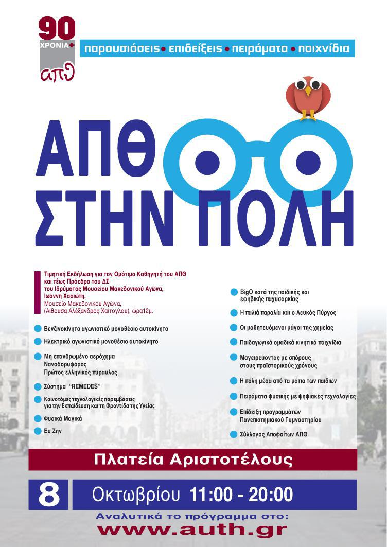 Το ΑΠΘ “βγαίνει” στην πόλη και υπό τον τίτλο «ΑΠΘ στην πόλη» μεταμορφώνει για μία ολόκληρη ημέρα την πλατεία Αριστοτέλους σε ένα μεγάλο εκπαιδευτικό πάρκο, δίνοντας την δυνατότητα σε όλους την Κυριακή 8 Οκτωβρίου 2017, να γνωρίσουν το έργο του, τις καινοτόμες εφαρμογές και εφευρέσεις του αλλά και τους δημιουργούς τους.