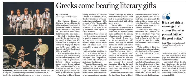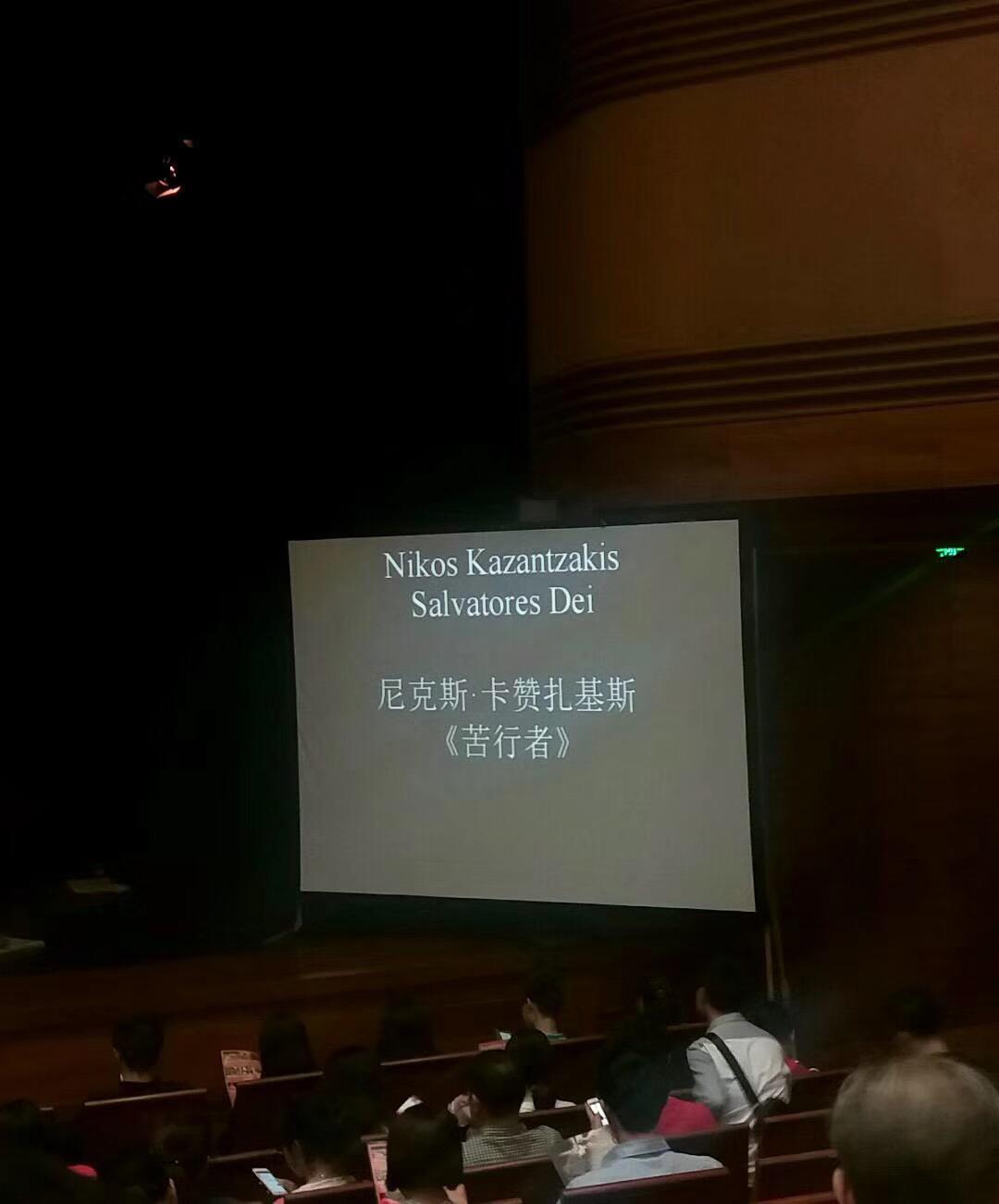 Πάνω από 100 Κινέζοι φοιτητές και καλλιτέχνες ενημερώνονται για τα κοινά στοιχεία του ελληνικού αρχαίου δράματος και της κινεζικής όπερας, για τη ζωή και το έργο του Νίκου Καζαντζάκη και θέτουν ερωτήματα για το ελληνικό θέατρο, την παράσταση και το φιλοσοφικό υπόβαθρο του συγγραφέα. Μια χορεύτρια παραδοσιακών χορών μας ρώτησε να της εξηγήσουμε πώς γίνεται: «να σπάει η μοναξιά σε κομμάτια» (φράση από την Ασκητική). Τι να απαντήσει κανείς;