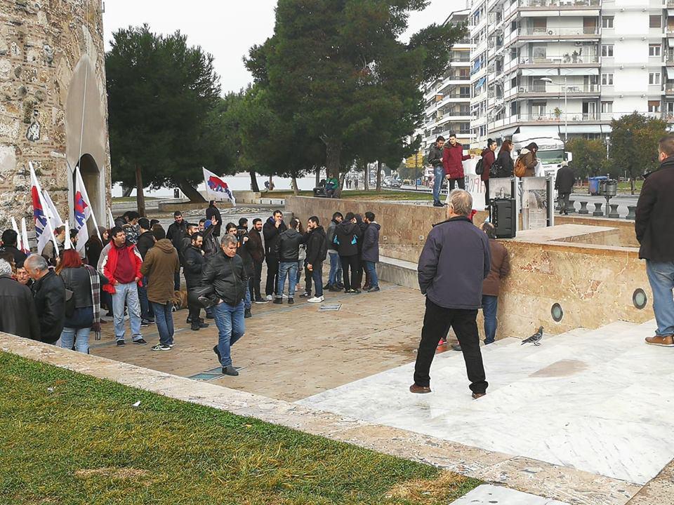 Μέλη του ΠΑΜΕ συγκεντρώθηκαν αιφνιδίως, ανέβηκαν στον Λευκό Πύργο και ανάρτησαν πανό με σύνθημα σχετικά με το νομοσχέδιο για την απεργία, ως πρόδρομο για τις αυριανές τους κινητοποιήσεις.