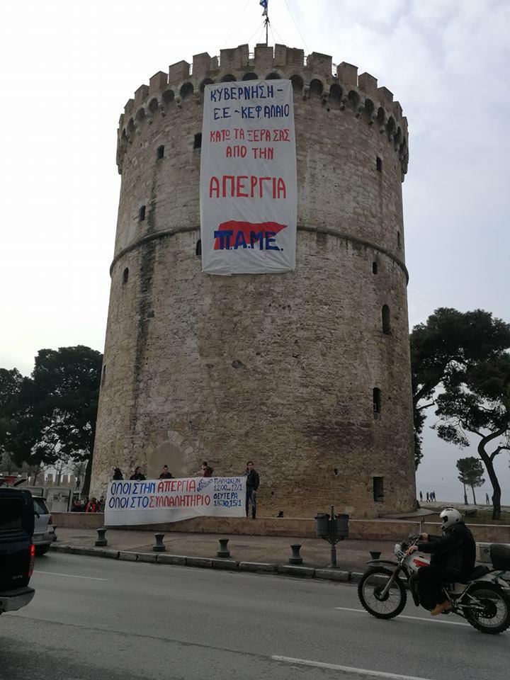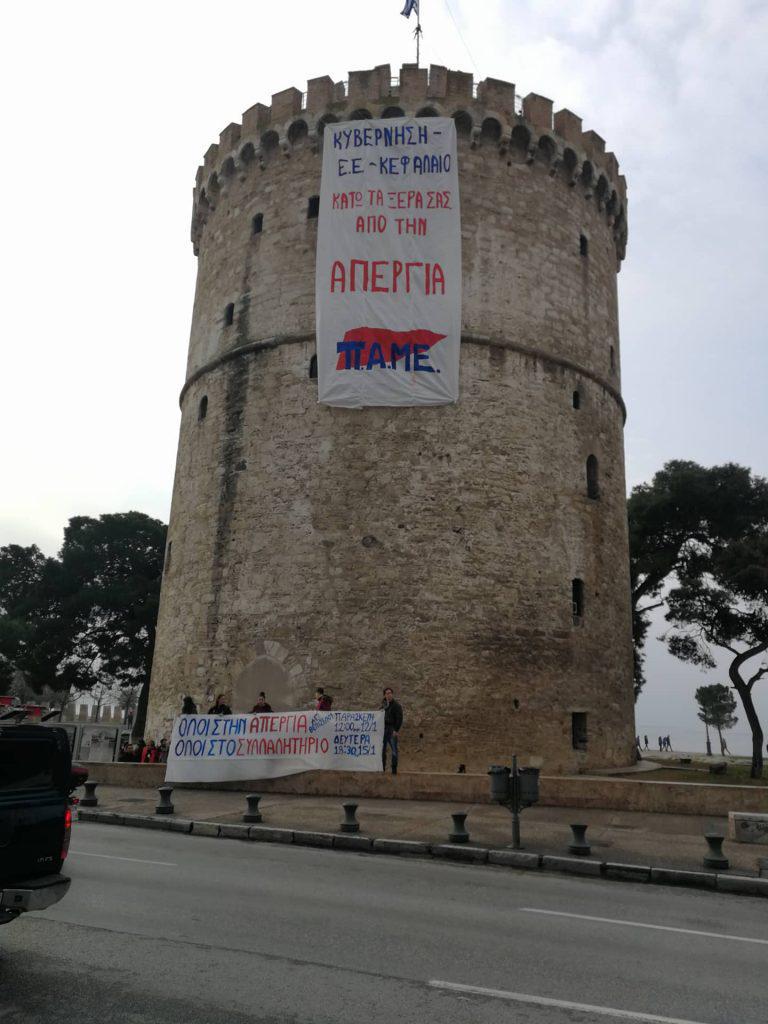 Το ΠΑΜΕ μπήκε στον Λευκό Πύργο και ανάρτησε πανό