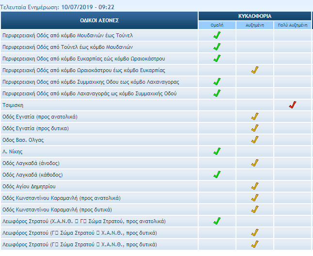 Εξαιρετικά χαμηλές ταχύτητες επικρατούν επίσης και στον Περιφερειακό από κόμβο Ωραιοκάστρου έως κόμβο Ευκαρπίας, και στα δύο ρεύματα της Εγνατίας, στην Βασ. Όλγας, στην άνοδο της Λαγκαδά, την Αγίου Δημητρίου, την Κωνσταντίνου Καραμανλή προς ανατολικά αλλά και προς δυτικά και στη Λεωφόρο Στρατού.