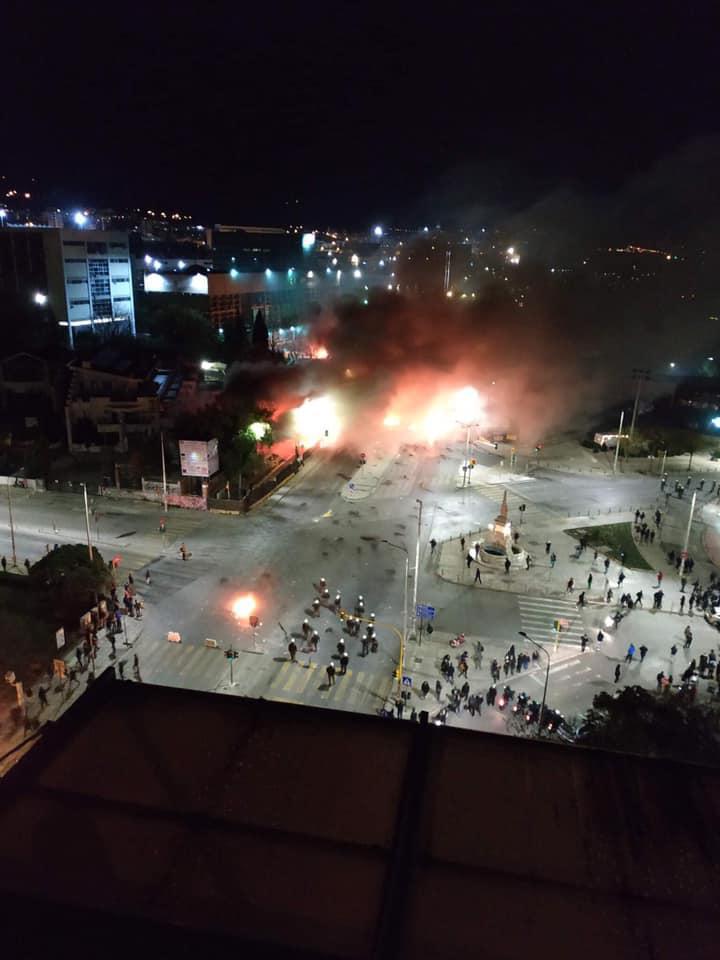 Ομάδα περίπου 50-70 ατόμων βρήκε στην οδό Εγνατία από τη Θεολογική Σχολή, που τελεί υπό κατάληψη, και πέταξε βόμβες μολότοφ στην περιοχή του Συντριβανίου. Οι δυνάμεις των ΜΑΤ έκαναν χρήση χειροβομβίδων κρότου-λάμψης με αποτέλεσμα τα άτομα που προκάλεσαν τα επεισόδια να κατευθυνθούν προς τη Θεολογική Σχολή.