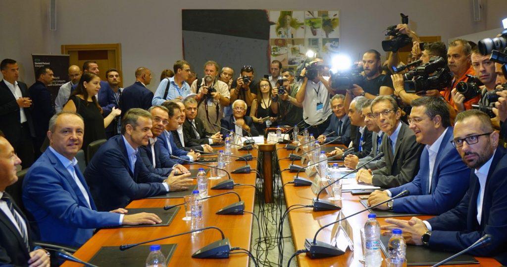 Ο Κωνσταντίνος Ζέρβας χάρισε μία γραβάτα που φέρει το λογότυπο του δήμου Θεσσαλονίκης στον Κυριάκο Μητσοτάκη.