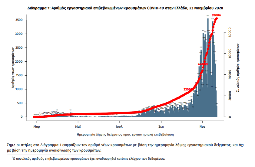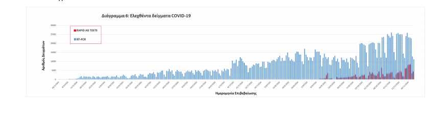 Δείγματα που έχουν ελεγχθεί: Από την 1η Ιανουαρίου 2020 μέχρι σήμερα, στα εργαστήρια που διενεργούν ελέγχους για τον νέο κορωνοϊό (SARS-CoV-2) και που δηλώνουν συστηματικά στον ΕΟΔΥ το σύνολο των δειγμάτων που ελέγχουν, έχουν συνολικά ελεγχθεί 2247132 κλινικά δείγματα ενώ από Μονάδες Υγείας και Κλιμάκια του ΕΟΔΥ που διενεργούν ελέγχους Rapid Ag έχουν ελεγχθεί 156753 δείγματα.