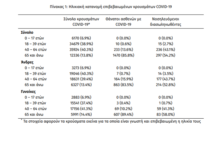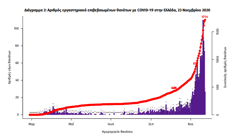 Τέλος, έχουμε 84 ακόμα καταγεγραμμένους θανάτους και 1714 θανάτους συνολικά στη χώρα. 678 (39.6%) γυναίκες και οι υπόλοιποι άνδρες. Η διάμεση ηλικία των θανόντων συμπολιτών μας ήταν τα 80 έτη και το 97.1% είχε κάποιο υποκείμενο νόσημα ή/και ηλικία 70 ετών και άνω.