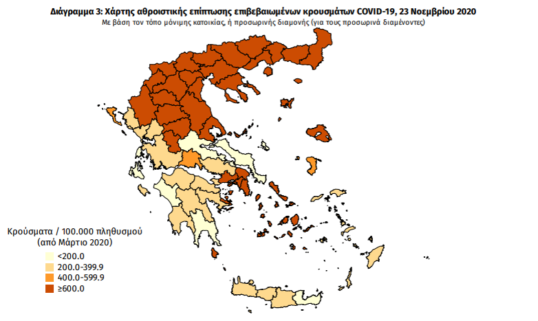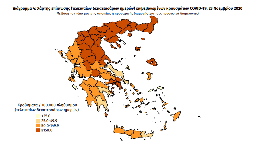 Ο χάρτης αποτυπώνει τη γεωγραφική κατανομή των συνολικών κρουσμάτων COVID-19 (από την αρχή της επιδημίας) ανά Περιφερειακή Ενότητα της χώρας, με βάση την δηλωθείσα διεύθυνση μόνιμης κατοικίας του ασθενούς, ή τη διεύθυνση προσωρινής διαμονής για τους τουρίστες και άλλους προσωρινά διαμένοντες στην Ελλάδα. Συμπεριλαμβάνονται τόσο κρούσματα με ιστορικό ταξιδίου (“εισαγόμενα”) όσο και κρούσματα με πιθανή εγχώρια μετάδοση.