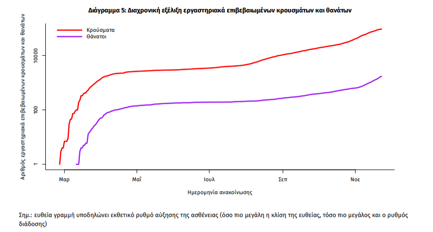 Η διαχρονική εξέλιξη των συνολικών κρουσμάτων και συνολικού αριθμού των θανάτων ασθενών COVID-19 παρουσιάζεται στο ακόλουθο διάγραμμα (σε λογαριθμική κλίμακα).