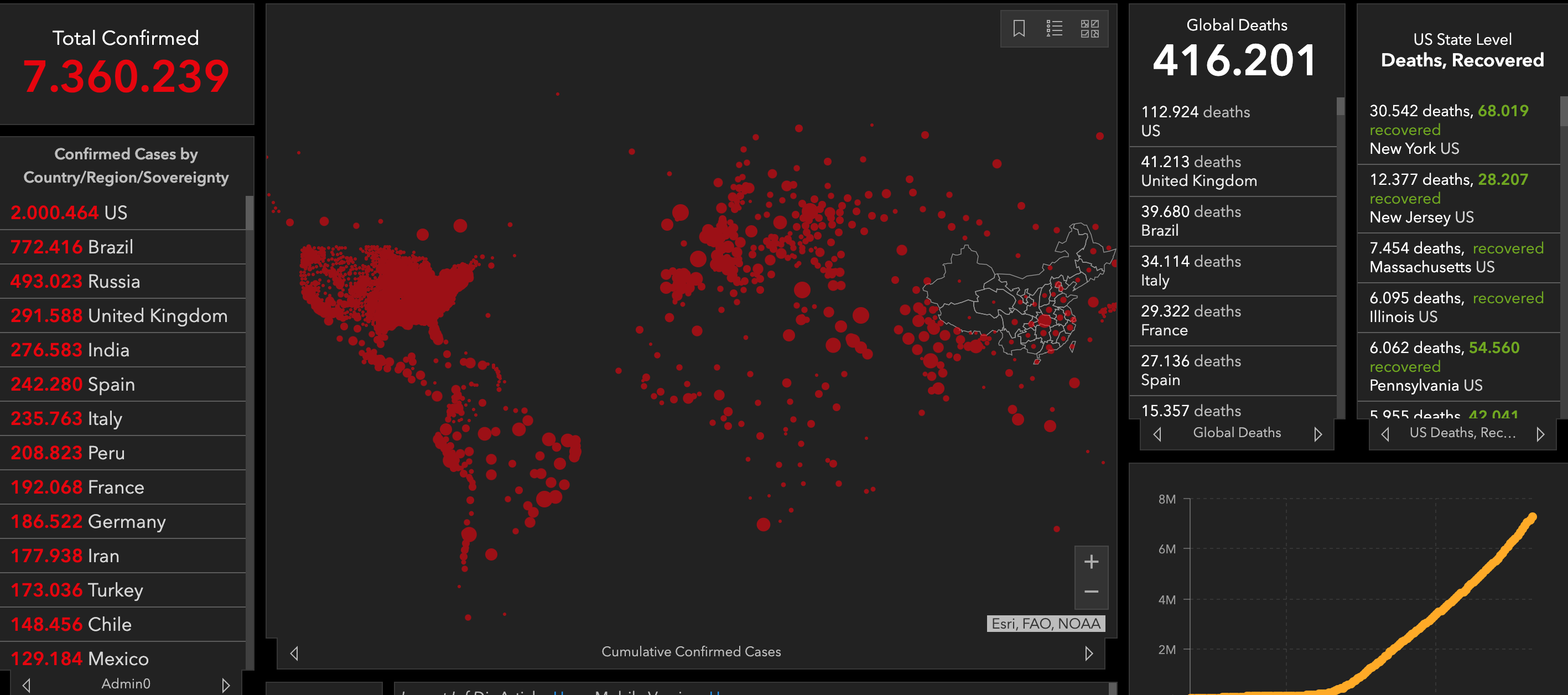 Περισσότεροι από 7.360.239 άνθρωποι έχουν διαγνωστεί με κορωνοϊό επίσημα σε 196 χώρες και εδάφη από την έναρξη της επιδημίας, από τους οποίους τουλάχιστον 3.227.700 θεωρούνται θεραπευμένοι.