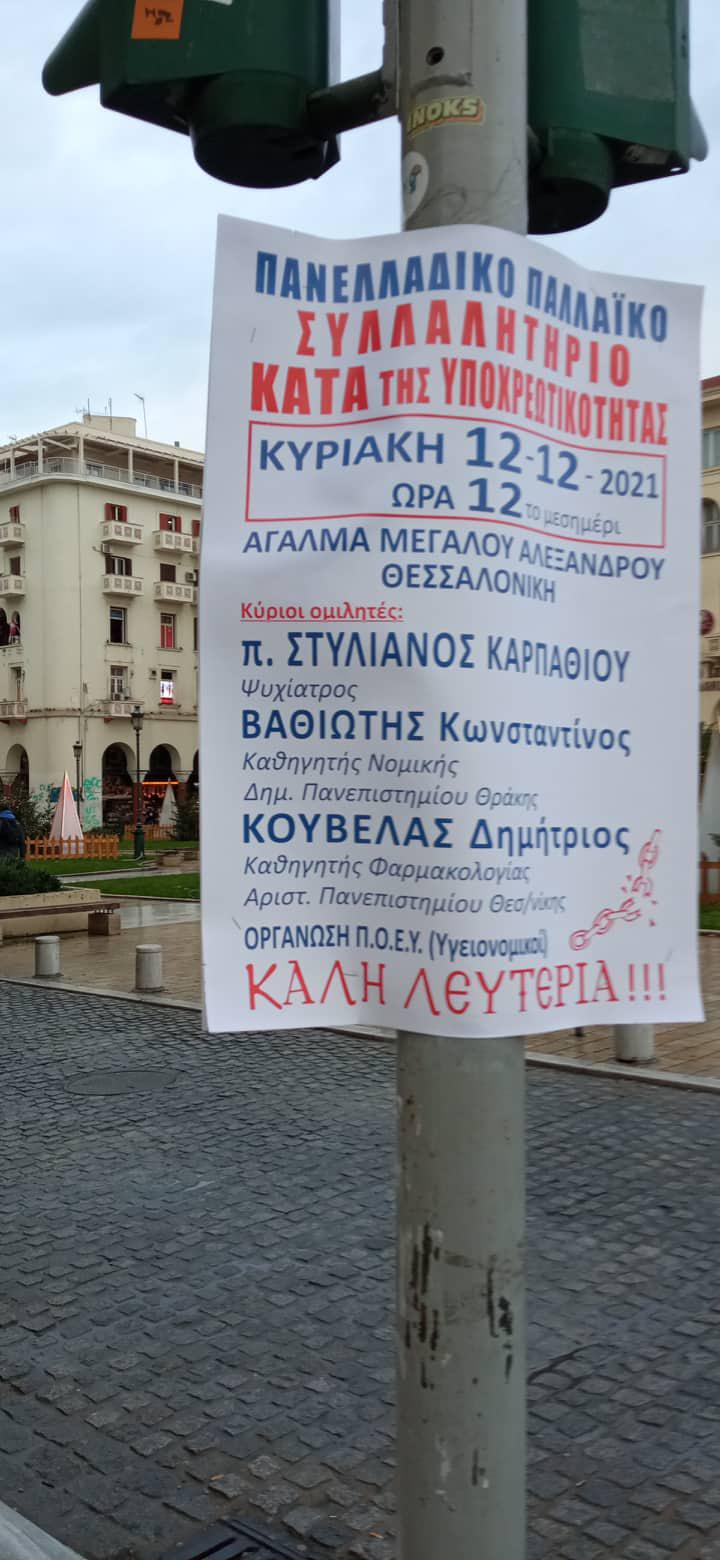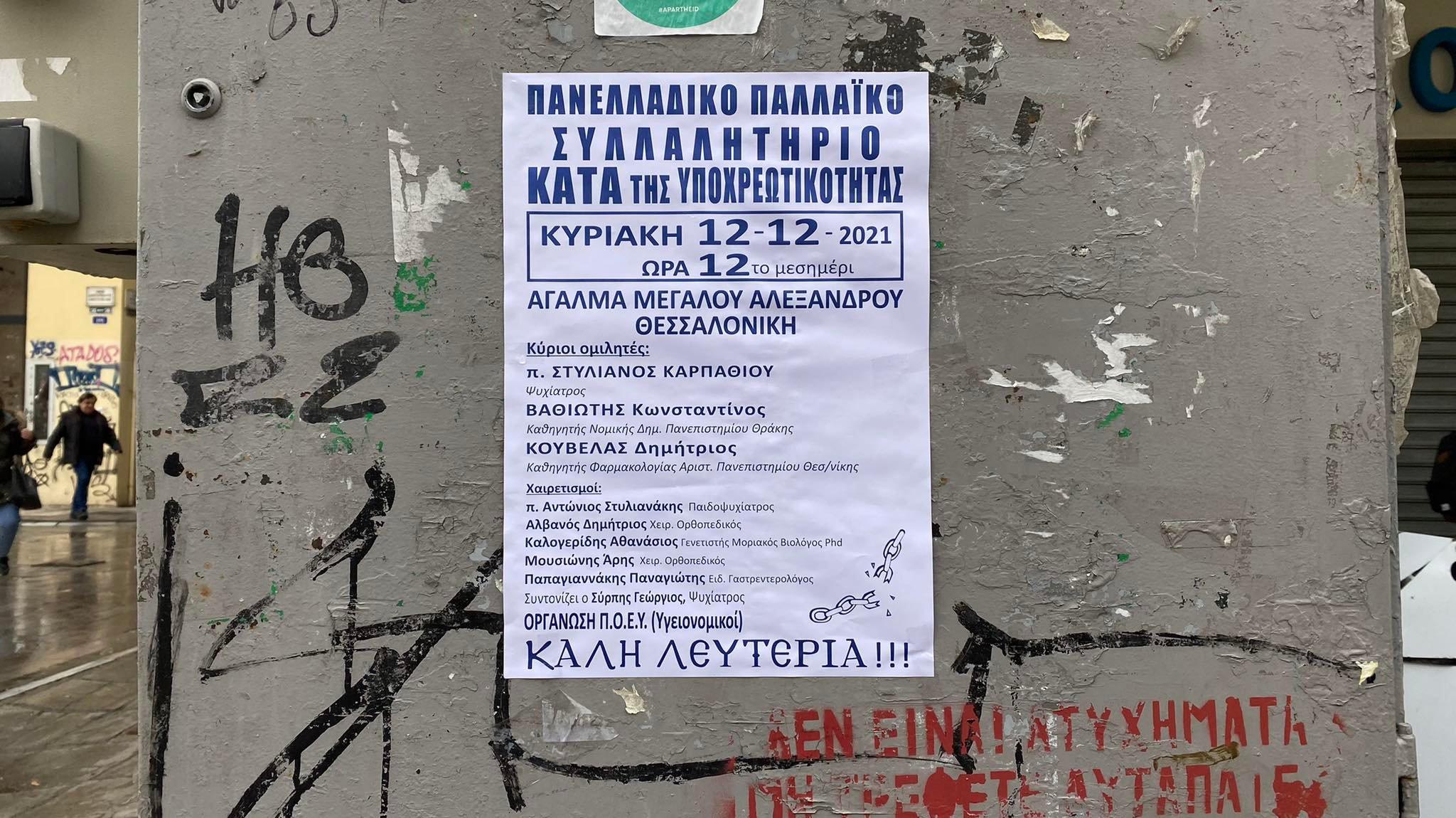 Με αφίσες για τη συγκέντρωση κατά της υποχρεωτικότητας γέμισε η Θεσσαλονίκη από το πρωί της Παρασκευής.