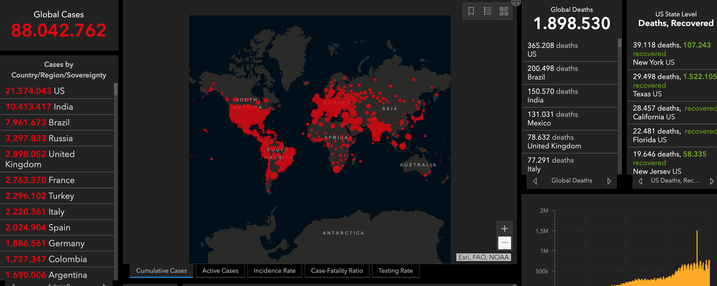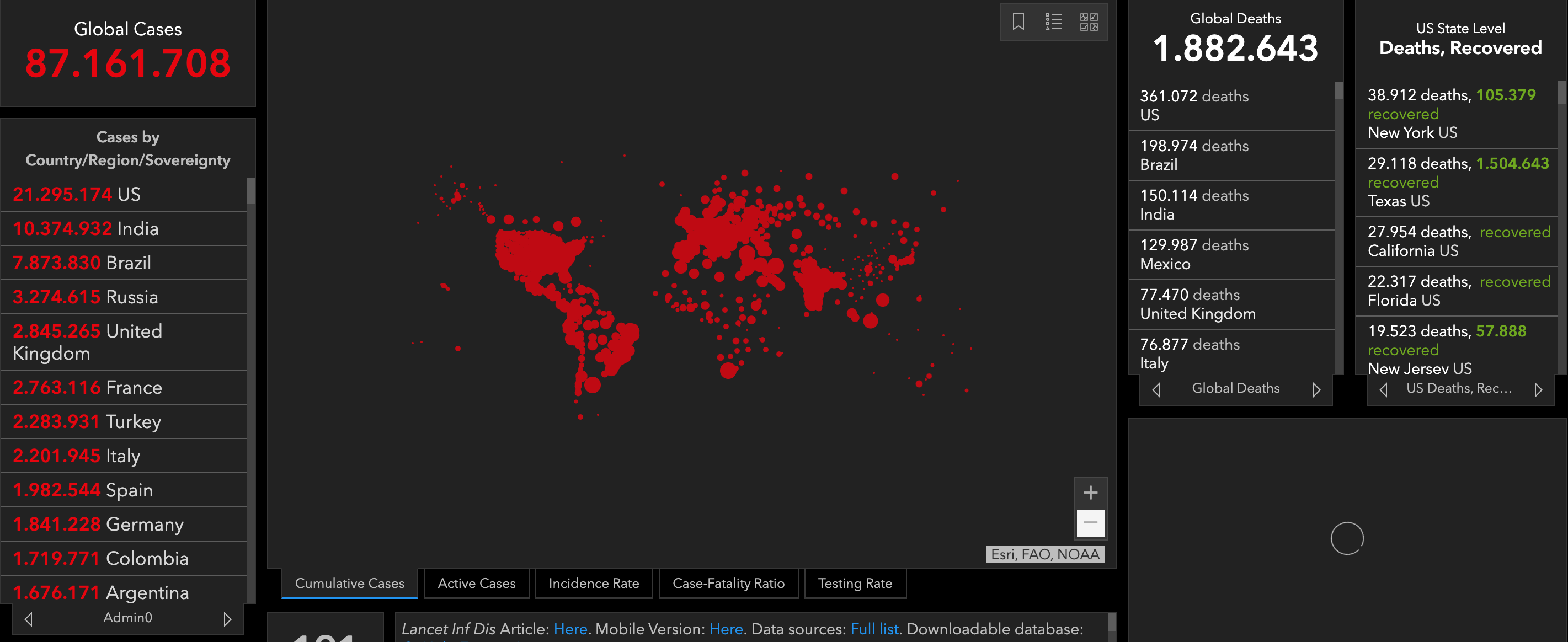 Ο απολογισμός της πανδημίας του νέου κορονοϊού στη χώρα που υφίσταται το βαρύτερο πλήγμα στον κόσμο σε απόλυτα μεγέθη έχει πλέον φθάσει τους σχεδόν 365.000 νεκρούς επί συνόλου 21,5 εκατομμυρίων μολύνσεων, κατά τα δεδομένα που συγκεντρώνει το Τζονς Χόπκινς, τα οποία ανανεώνονται συνεχώς.