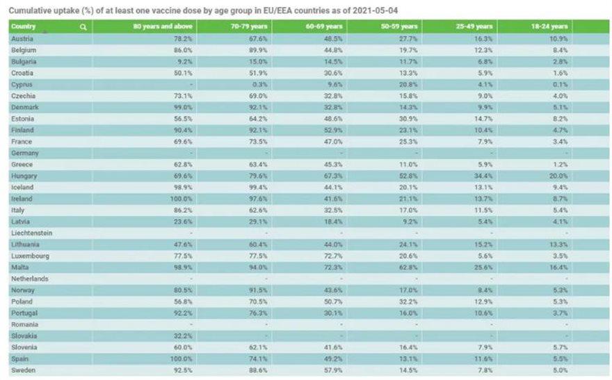 Όσον αφορά στις μεγαλύτερες ηλικίες, στην Ιρλανδία και την Ισπανία οι άνω των 80 ετών έχουν εμβολιαστεί σε ποσοστό 100%.