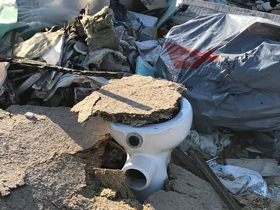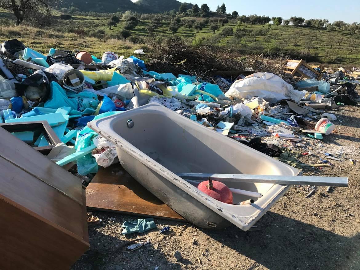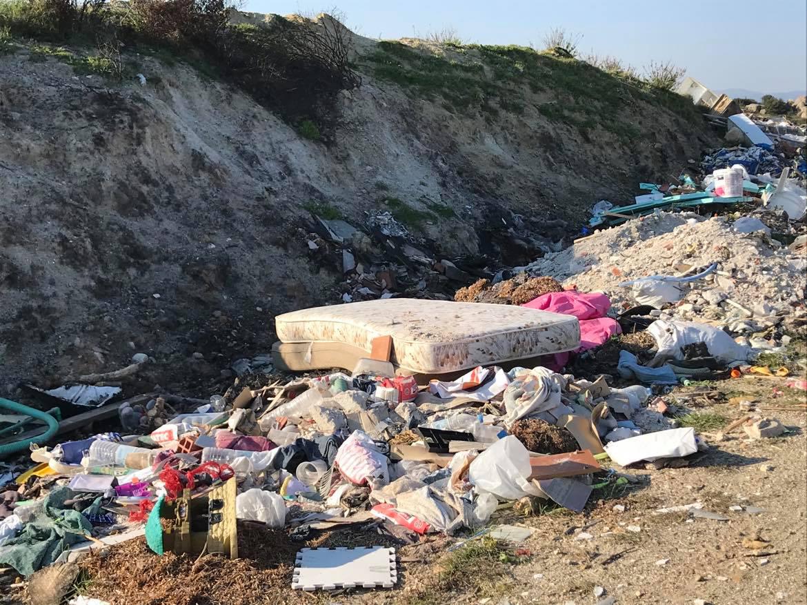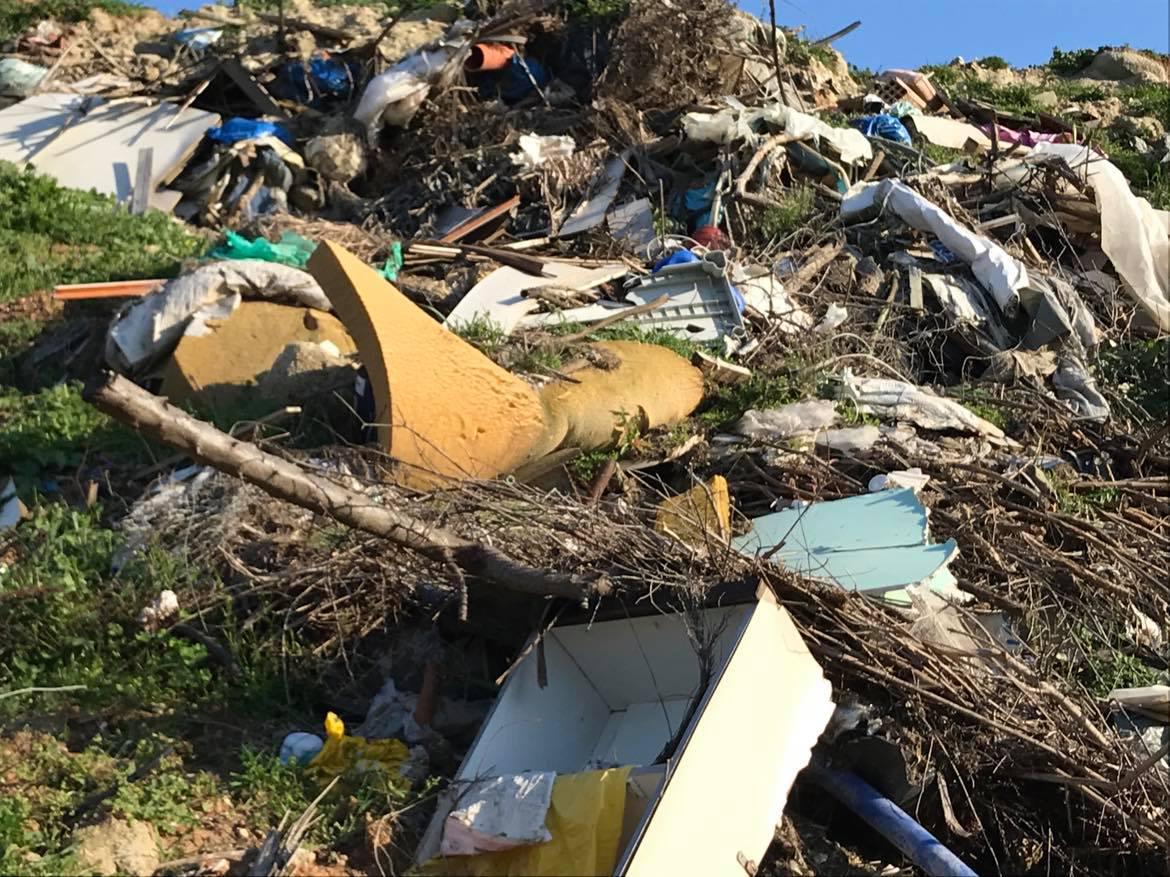 Μπάζα, στρώματα, παλιά έπιπλα, είδη υγιεινής, παρά τις ταμπέλες που αποτρέπουν την ρίψη σκουπιδιών.