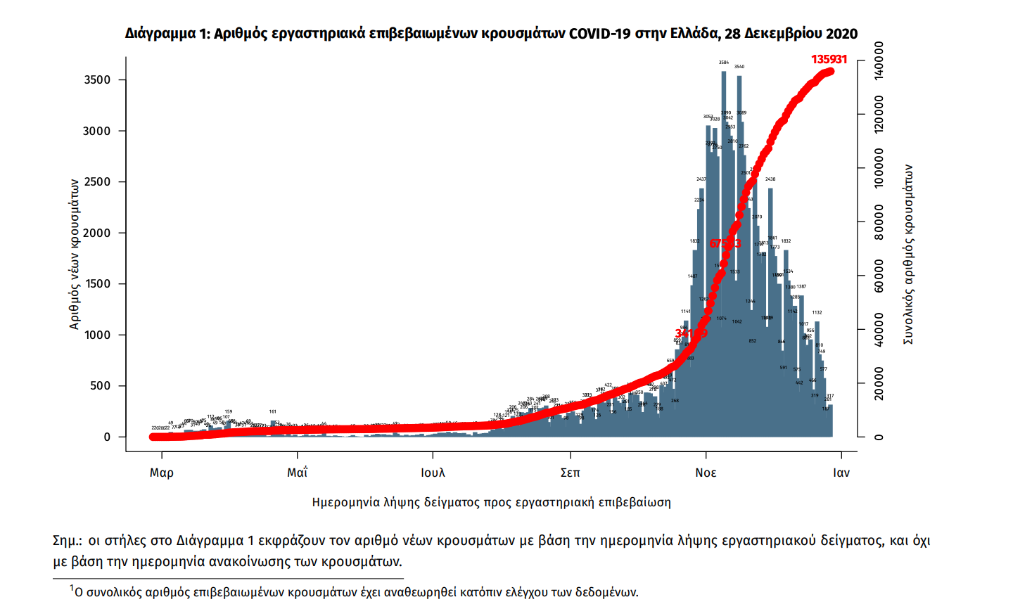 Ο συνολικός αριθμός των κρουσμάτων ανέρχεται σε 135931 (ημερήσια μεταβολή +0.4%), εκ των οποίων 52.4% άνδρες. 1 Οι νέοι θάνατοι ασθενών με COVID-19 είναι 66, ενώ από την έναρξη της επιδημίας έχουν καταγραφεί συνολικά 4672 θάνατοι.Η διάμεση ηλικία των ασθενών που απεβίωσαν είναι 79 έτη. Ο αριθμός των ασθενών που νοσηλεύονται διασωληνωμένοι είναι 467 (68.7% άνδρες). Η ημερήσια κατανομή των επιβεβαιωμένων κρουσμάτων είναι η ακόλουθη (η γραμμή παριστάνει την συνολική, αθροιστική κατανομή των κρουσμάτων).