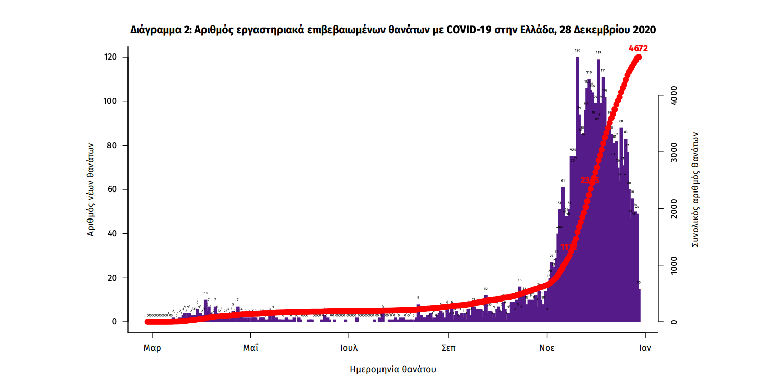 Τέλος, έχουμε 66 ακόμα καταγεγραμμένους θανάτους και 4672 θανάτους συνολικά στη χώρα. 1899 (40.6%) γυναίκες και οι υπόλοιποι άνδρες. Η διάμεση ηλικία των θανόντων συμπολιτών μας ήταν τα 79 έτη και το 95.4% είχε κάποιο υποκείμενο νόσημα ή/και ηλικία 70 ετών και άνω.