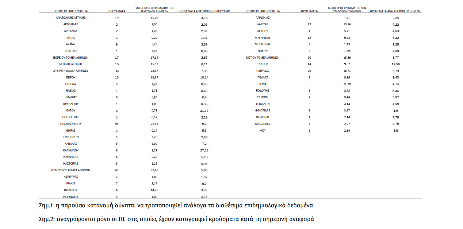 Γεωγραφική διασπορά Ο χάρτης αποτυπώνει τη γεωγραφική κατανομή των συνολικών κρουσμάτων COVID-19 (από την αρχή της επιδημίας) ανά Περιφερειακή Ενότητα της χώρας, με βάση την δηλωθείσα διεύθυνση μόνιμης κατοικίας του ασθενούς, ή τη διεύθυνση προσωρινής διαμονής για τους τουρίστες και άλλους προσωρινά διαμένοντες στην Ελλάδα. Συμπεριλαμβάνονται τόσο κρούσματα με ιστορικό ταξιδίου (“εισαγόμενα”) όσο και κρούσματα με πιθανή εγχώρια μετάδοση.