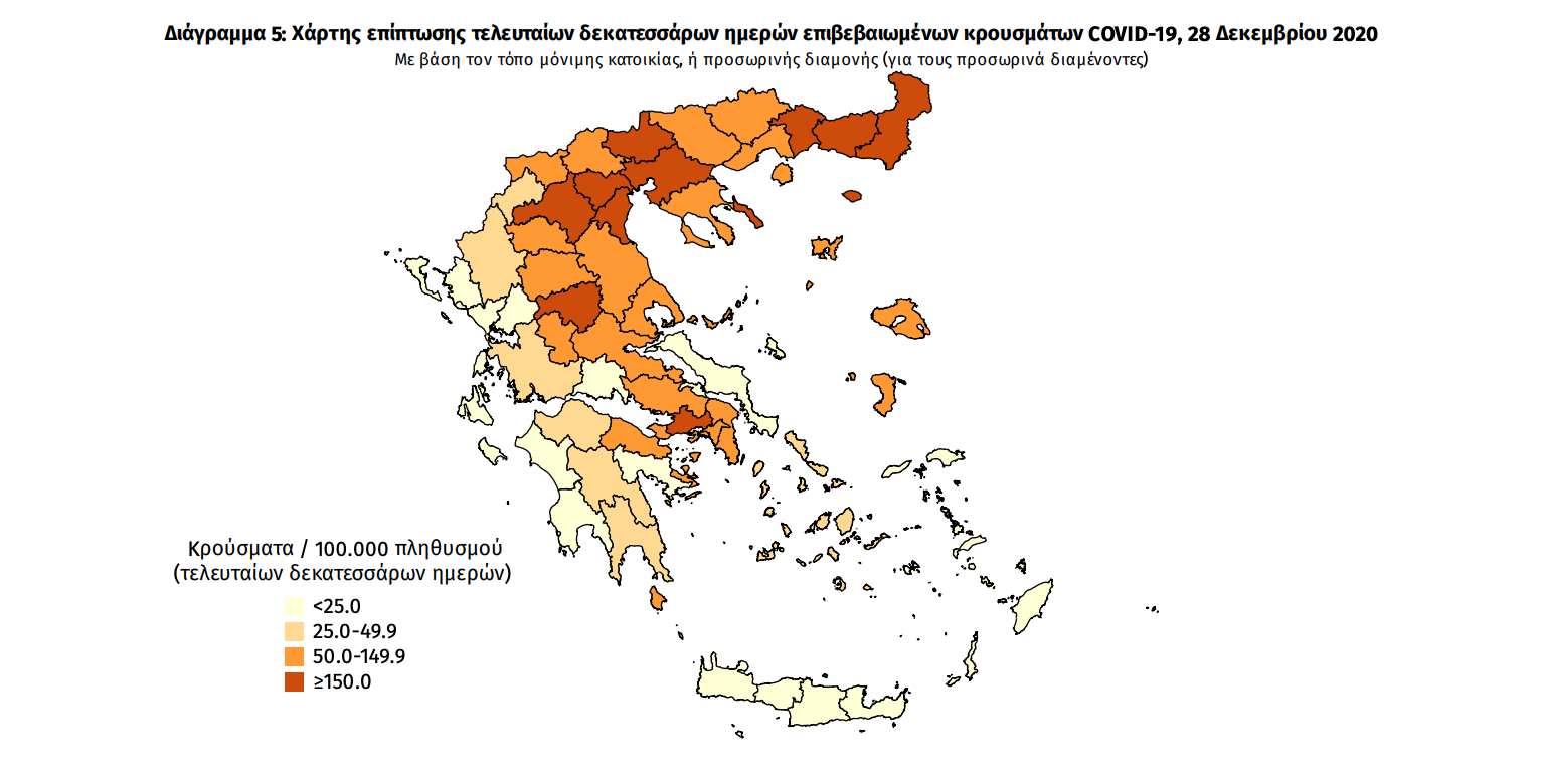 Τα στοιχεία που παρουσιάζονται αφορούν περιστατικά από την επιδημιολογική επιτήρηση της νόσου από το νέο κορωνοϊό (COVID19), με βάση τα δεδομένα που έχουν δηλωθεί στον ΕΟΔΥ και καταγραφεί μέχρι τις 28 Δεκεμβρίου 2020 (ώρα 15:00). Τα νέα εργαστηριακά επιβεβαιωμένα κρούσματα της νόσου είναι 476, εκ των οποίων 8 εντοπίστηκαν κατόπιν ελέγχων στις πύλες εισόδου της χώρας.