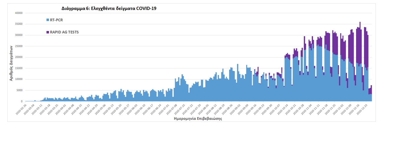 Δείγματα που έχουν ελεγχθεί: Από την 1η Ιανουαρίου 2020 μέχρι σήμερα, στα εργαστήρια που διενεργούν ελέγχους για τον νέο κορωνοϊό (SARS-CoV-2) και που δηλώνουν συστηματικά στον ΕΟΔΥ το σύνολο των δειγμάτων που ελέγχουν, έχουν συνολικά ελεγχθεί 2.759.530 κλινικά δείγματα ενώ από Μονάδες Υγείας και Κλιμάκια του ΕΟΔΥ που διενεργούν ελέγχους Rapid Ag έχουν ελεγχθεί 524.091 δείγματα.
