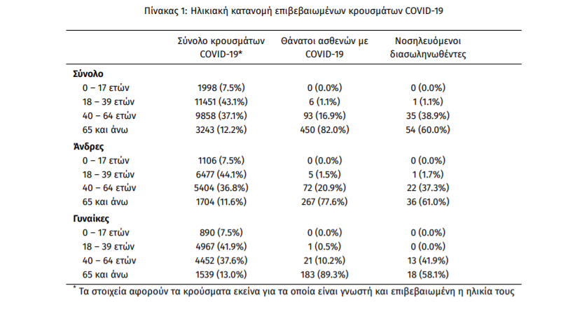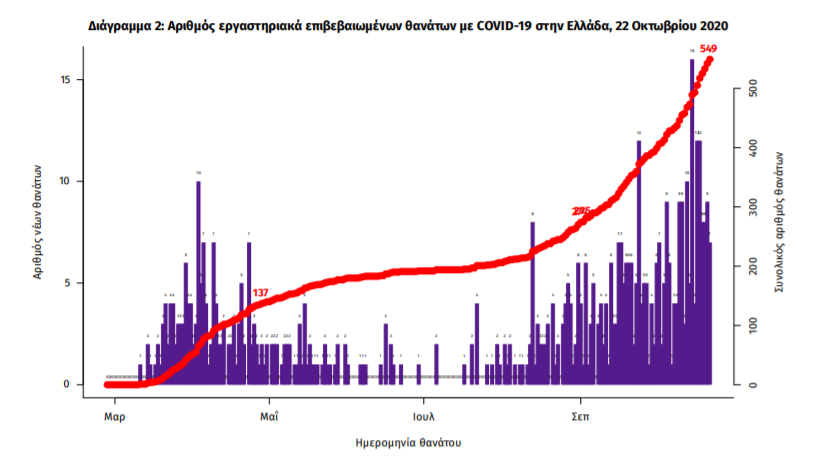 Τέλος, έχουμε 15 ακόμα καταγεγραμμένους θανάτους και 549 θανάτους συνολικά στη χώρα. 205 (37.3%) γυναίκες και οι υπόλοιποι άνδρες. Η διάμεση ηλικία των θανόντων συμπολιτών μας ήταν τα 79 έτη και το 96.2% είχε κάποιο υποκείμενο νόσημα ή/και ηλικία 70 ετών και άνω.