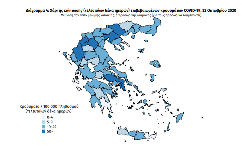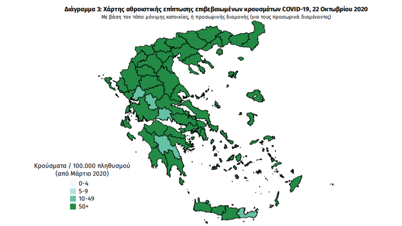 Ο χάρτης αποτυπώνει τη γεωγραφική κατανομή των συνολικών κρουσμάτων COVID-19 (από την αρχή της επιδημίας) ανά Περιφερειακή Ενότητα της χώρας, με βάση την δηλωθείσα διεύθυνση μόνιμης κατοικίας του ασθενούς, ή τη διεύθυνση προσωρινής διαμονής για τους τουρίστες και άλλους προσωρινά διαμένοντες στην Ελλάδα. Συμπεριλαμβάνονται τόσο κρούσματα με ιστορικό ταξιδίου (“εισαγόμενα”) όσο και κρούσματα με πιθανή εγχώρια μετάδοση.
