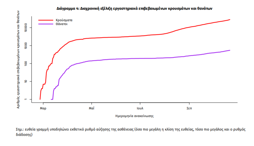 Η διαχρονική εξέλιξη των συνολικών κρουσμάτων και συνολικού αριθμού των θανάτων ασθενών COVID-19 παρουσιάζεται στο ακόλουθο διάγραμμα (σε λογαριθμική κλίμακα).