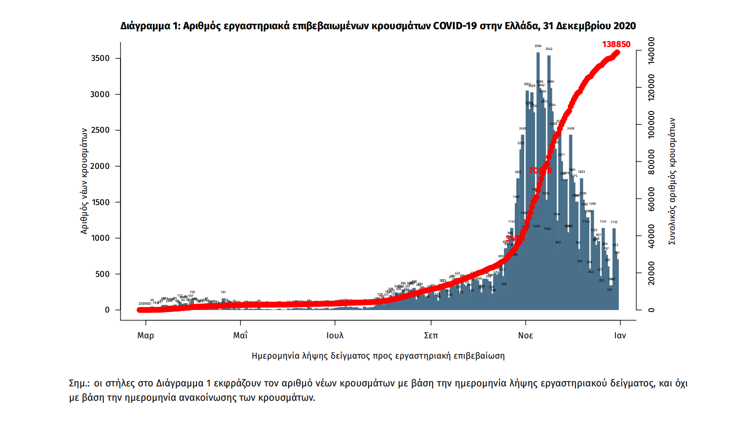 Τα στοιχεία που παρουσιάζονται αφορούν περιστατικά από την επιδημιολογική επιτήρηση της νόσου από το νέο κορωνοϊό (COVID19), με βάση τα δεδομένα που έχουν δηλωθεί στον ΕΟΔΥ και καταγραφεί μέχρι τις 31 Δεκεμβρίου 2020 (ώρα 15:00). Τα νέα εργαστηριακά επιβεβαιωμένα κρούσματα της νόσου είναι 932, εκ των οποίων 3 εντοπίστηκαν κατόπιν ελέγχων στις πύλες εισόδου της χώρας. Ο συνολικός αριθμός των κρουσμάτων ανέρχεται σε 138850 (ημερήσια μεταβολή +0.7%), εκ των οποίων 52.3% άνδρες.