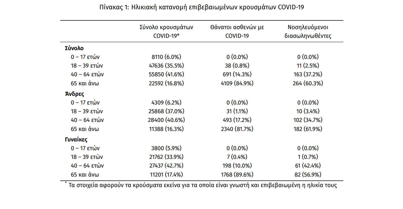 Η διάμεση ηλικία των κρουσμάτων είναι 44 έτη (εύρος 0.2 έως 104 ετών), ενώ η διάμεση ηλικία των θανάτων είναι 79 έτη (εύρος 24 έως 103 ετών). Η ηλικιακή κατανομή των (α) συνολικών κρουσμάτων, (β) των περιστατικών που κατέληξαν σε θάνατο και (γ) των ασθενών που νοσηλεύονται διασωληνωμένοι, είναι η ακόλουθη: