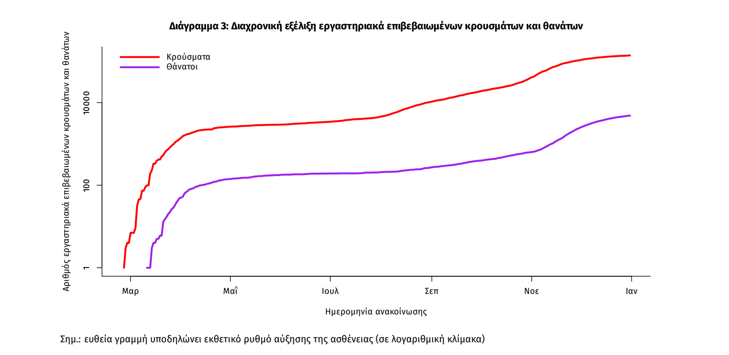 Η διαχρονική εξέλιξη των συνολικών κρουσμάτων και συνολικού αριθμού των θανάτων ασθενών COVID-19 παρουσιάζεται στο ακόλουθο διάγραμμα.