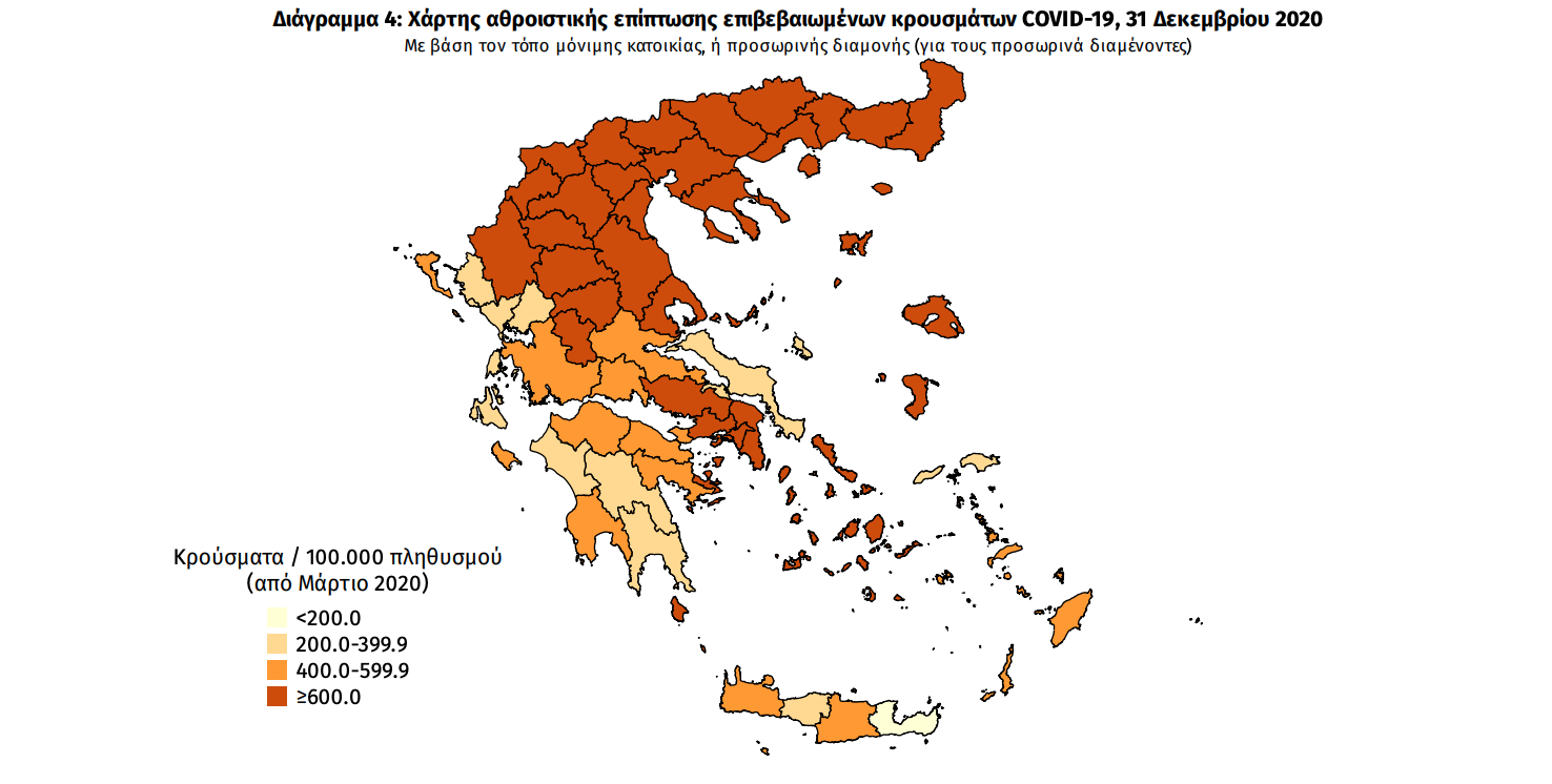 Γεωγραφική διασπορά Ο χάρτης αποτυπώνει τη γεωγραφική κατανομή των συνολικών κρουσμάτων COVID-19 (από την αρχή της επιδημίας) ανά Περιφερειακή Ενότητα της χώρας, με βάση την δηλωθείσα διεύθυνση μόνιμης κατοικίας του ασθενούς, ή τη διεύθυνση προσωρινής διαμονής για τους τουρίστες και άλλους προσωρινά διαμένοντες στην Ελλάδα. Συμπεριλαμβάνονται τόσο κρούσματα με ιστορικό ταξιδίου (“εισαγόμενα”) όσο και κρούσματα με πιθανή εγχώρια μετάδοση.