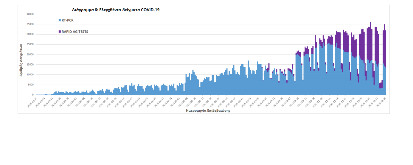 Δείγματα που έχουν ελεγχθεί: Από την 1η Ιανουαρίου 2020 μέχρι σήμερα, στα εργαστήρια που διενεργούν ελέγχους για τον νέο κορωνοϊό (SARS-CoV-2) και που δηλώνουν συστηματικά στον ΕΟΔΥ το σύνολο των δειγμάτων που ελέγχουν, έχουν συνολικά ελεγχθεί 2.803.026 κλινικά δείγματα ενώ από Μονάδες Υγείας και Κλιμάκια του ΕΟΔΥ που διενεργούν ελέγχους Rapid Ag έχουν ελεγχθεί 579.462 δείγματα.